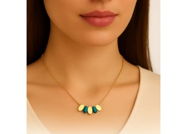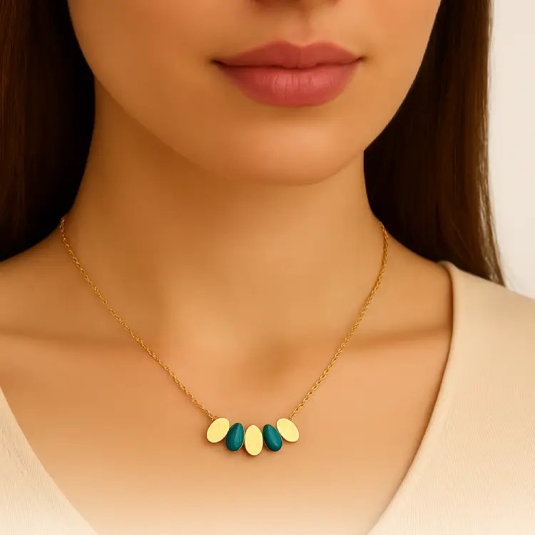 Subtil et lumineux, le collier Lydiane mêle élégance discrète et éclat naturel. Composé d’un fin maillon doré en acier inoxydable, il est orné de véritables pierres de malachite, reconnues pour leur teinte verte profonde et leurs vertus apaisantes.