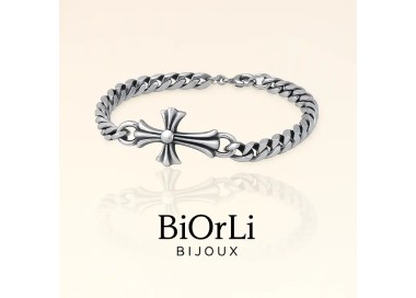 Gabriel - Bracelet Biker en Acier Noirci Maille Gourmette avec Croix de Lys