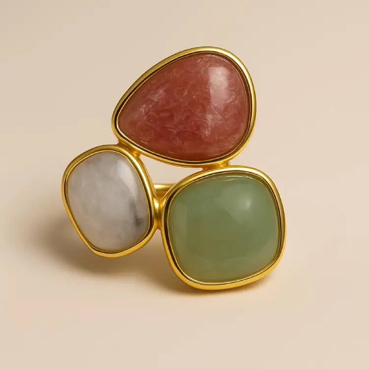 Aria : Bague Ouverte en Acier avec Trois Pierres Naturelles