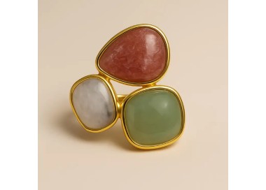 La bague Aria est une pièce de caractère, marquée par son design ouvert en acier inoxydable argenté et l'éclat de ses trois pierres naturelles. Cette bague ajustable s’adapte de la taille 52 à 56, offrant confort et style à toutes celles qui la portent.