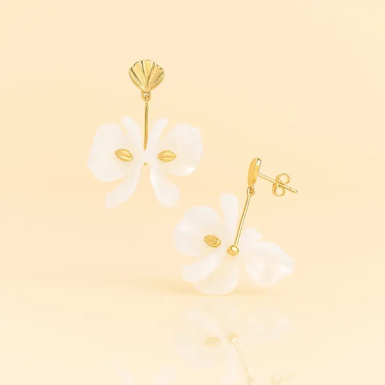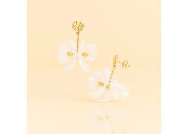 Découvrez les boucles d'oreilles Amélie, ornées de pendentifs en forme de fleur nacrée dorée, fabriquées en acier inoxydable. Garanties sans...