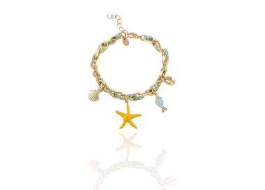 Apportez une touche d’élégance et d’évasion à votre style avec le bracelet Alix. Inspiré de l’univers marin, ce bijou délicat en acier inoxydable doré est sublimé par trois pampilles : un coquillage, une étoile de mer émaillée et un poisson nacré orné d’oxydes de zirconium.