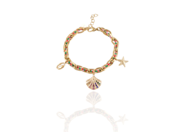 Le bracelet Naëlia est une véritable ode à l’élégance marine. Combinant la délicatesse d’un cordon tressé et la brillance d’une chaîne en acier inoxydable doré, il se pare de trois pampilles marines : un cauri, un coquillage serti d’oxydes de zirconium pour une touche scintillante et une étoile de mer dorée.
