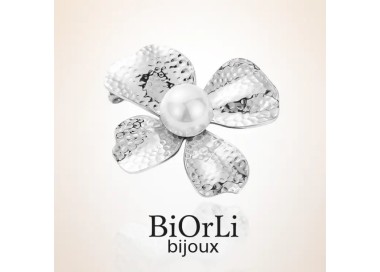 Kiran : Broche Fleur Martelée avec Perle Blanche en Acier Argenté