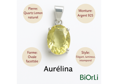 Le pendentif Aurélinea met en valeur un somptueux Quartz Lemon naturel, apprécié pour ses reflets lumineux oscillant entre le jaune doux et le citron clair. Sa taille ovale facettée lui confère une brillance remarquable, idéale pour illuminer chaque tenue avec élégance.